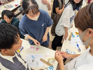 8月7日に実施された、静大生による科学工作「光る!ふるふるマグネット」では、中央にコイルを巻いた筒の中に磁石を入れて振ることでコイルから接続された電球が光ります。最後に部屋を真っ暗にしてみんなで筒を振ると、子供たちの周りで光がちらちらと明滅し、まるで蛍の群生地に迷い込んだようでした。