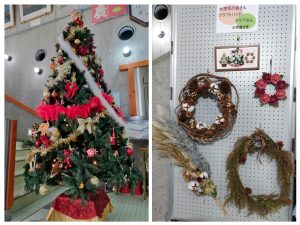 同時に水窪花の会、クラフトバンドクラブの皆さんの作品が展示されています。花の会の皆さんが制作したクリスマスリースは、山から採って来た地域ならではの素材を使用しています。