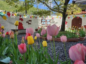 文化会館の中庭も華やかに春の装いに衣替えです。