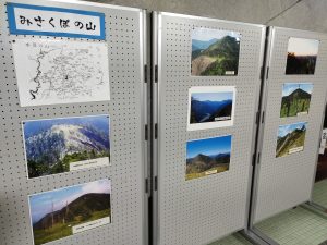 ホワイエには、「NPO法人山に生きる会」にご提供いただいた水窪町の山の写真とともに、同団体が選定した「水窪百山」の情報が展示されています。