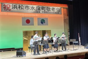 水窪文化会館ホールで行われる敬老会の式典の後の、演芸のパートをよかっつらみさくぼが運営しました。今年は「地域住民がみんなで祝う敬老会」をテーマに、水窪中学校クリエイティ部吹奏楽の皆さんを始め、地域内で活動する団体に敬老会を盛り上げていただきました。